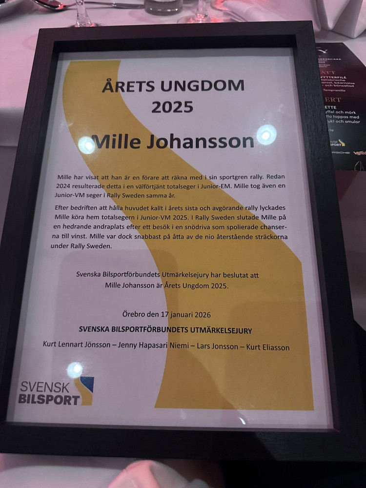 STORT GRATTIS MILLE! Katrineholms MK vill gratulera Mille Johansson till utmärkelsen ”Årets Ungdom” som han tilldelades vid bilsportgalan som hölls i Örebro den gångna helgen. Utöver detta fick Mille även mottaga pris för sina internationella prestationer som Junior världsmästare i Rally 2025.